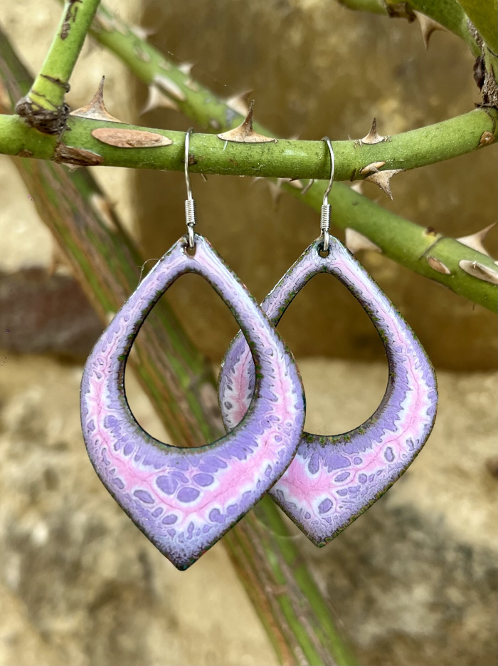 Grande boucles d’oreilles en émail sur cuivre réalisées entièrement à la main à Pérouges dans l’Ain, émaux sur cuivre uniques et originaux.